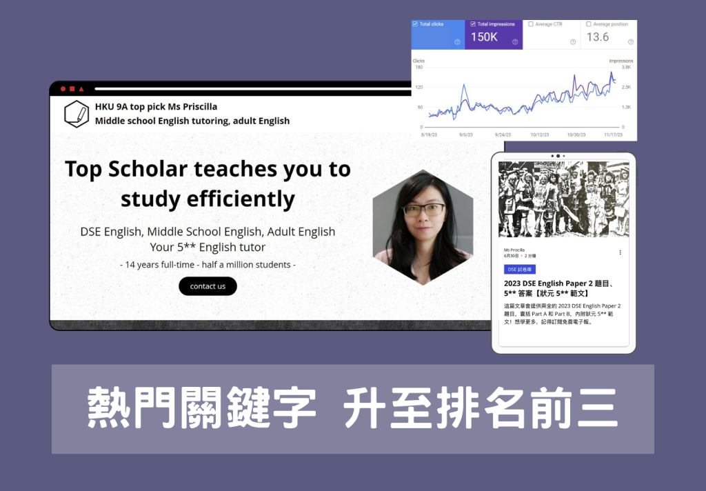 Flowdigital團隊針對多組英語課程相關關鍵字加強點擊率。其中「DSE英文補習」、「中學英文補習」、「成人英語」三組關鍵字已穩定佔據搜索排名首頁,網站排名流量和流量都獲得明顯的提升。