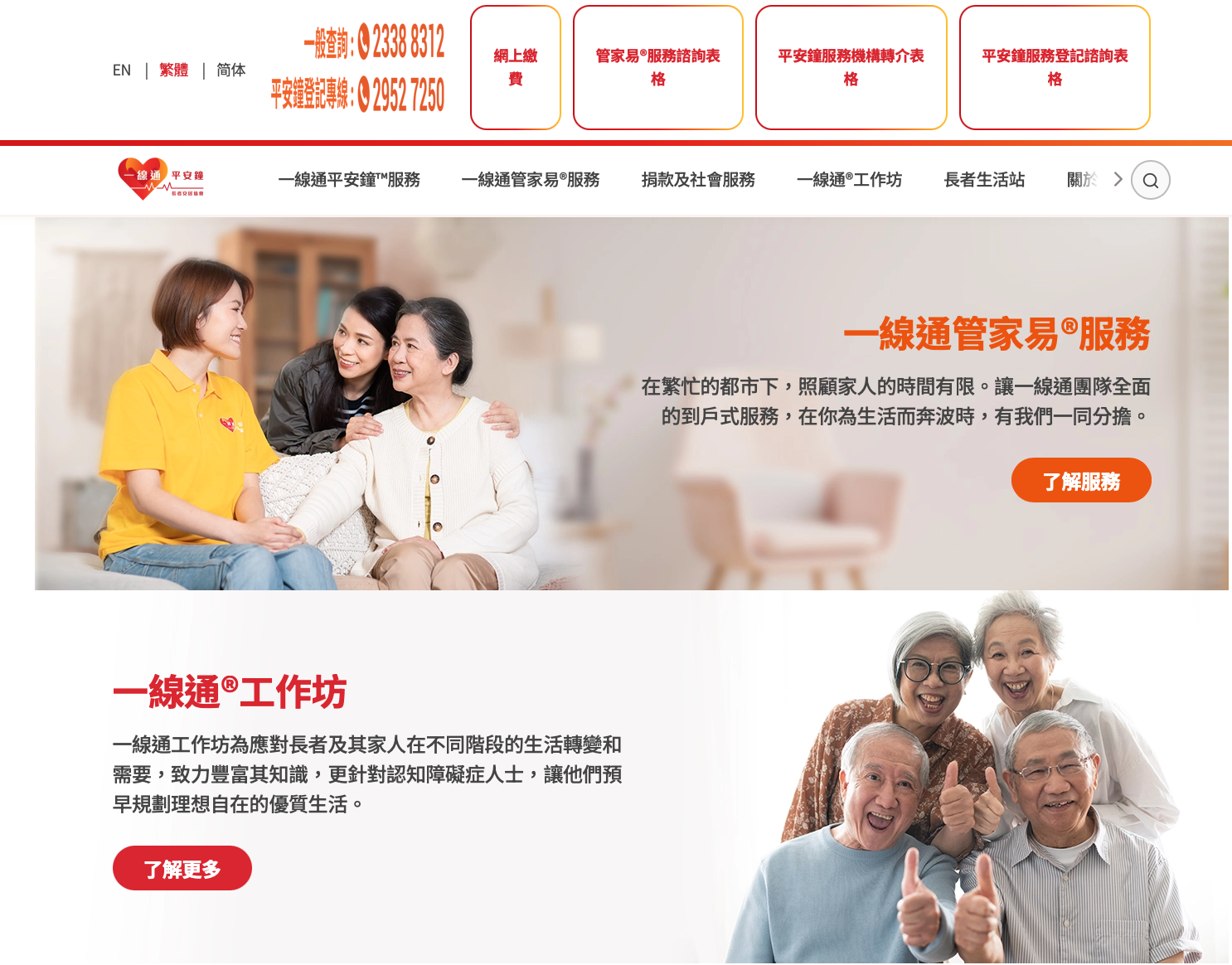 長者安居協會透過旗下的一線通服務,協助用戶及其家人。協會提供全天候24小時全面支援服務「一線通平安鐘™」,以緊急支援、綜合關顧、日夜守護、健康管理、生活輔助為主要的服務範疇。另設「管家易」上門看顧、陪診、清潔及復康服務,以減輕家人和照顧者壓力。
