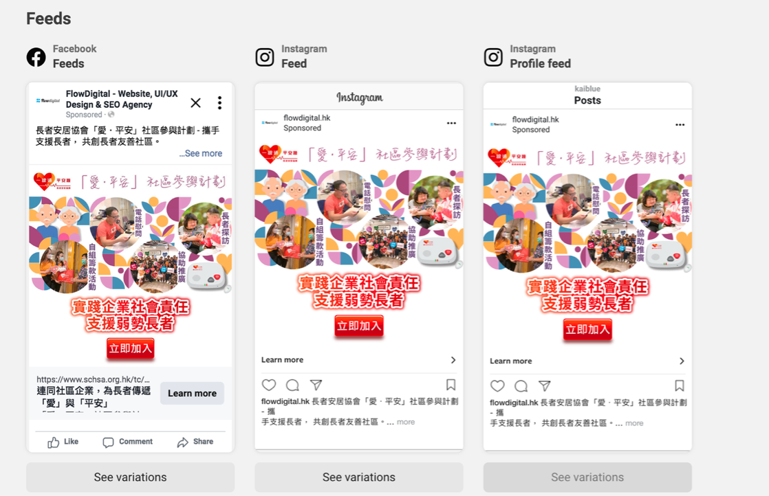 我們為長者安居協會優化了Meta廣告的位置, 包括Facebook 和Instagram, 運用不同形式的例如動態消息、限時動態、影片Reels 插播廣告、 搜尋結果和應用程式廣告, 擴大營銷信息,以傳達給更多的受眾。