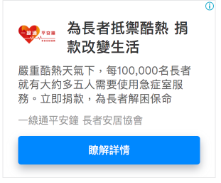 我們為長者安居協會選擇了易於觸及讀者的的位置, 其中一個便是Google,透過設立容易讓不同讀者觸及到的廣告,並投放在谷歌顯眼位置。這些帖子被設計鼓勵查詢,促使為父母尋找平安中的子女了解更多長者安居協會提供的服務。 此外,在客製化方面,我們的帖子圖片、標題和內容, 以下便是我們針對「酷熱天氣」的計劃特別所製的Google廣告,以幫助提高曝光率和知名度。